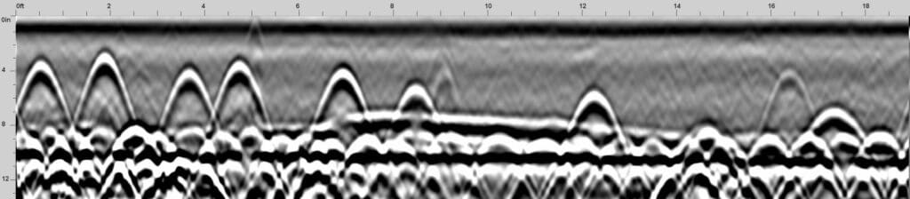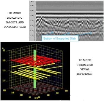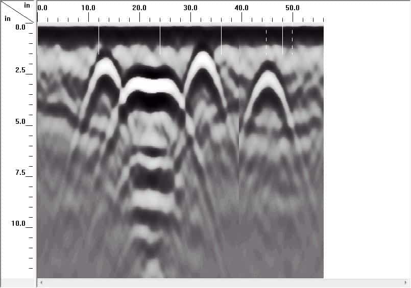 Ground Penetrating Radar is used to locate steel reinforcement, post tension cables, voids and conduits. Large areas can be achieved in a matter of minutes. No radiation hazard and only one side accessibility is required. With the aid of different antenna frequencies, depths from several inches up to several feet can be achieved. The customer must rely on the technicians’ interpretation, based on grayscale representation seen on a screen.